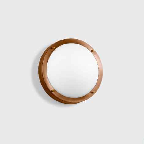 Die Außen Kupferleuchte für Wand und Decke ist in zwei Größen erhältlich. Die kleinere Variante hat einen Durchmesser von 220 Millimeter und ist 120 Millimeter tief wohingegen die größere Version einen Durchmesser von 220 Millimeter hat und 145 Millimeter tief ist.
