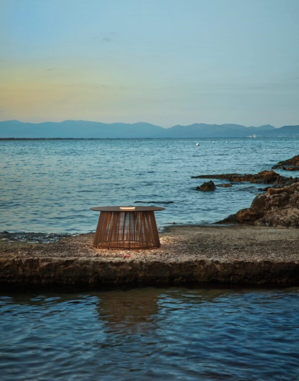 Der mediterrane Look dieser Bodenleuchte zeichnet sich durch eine kreisförmige Tischfläche aus, die auf einem konisch nach unten verlaufenden Schirm aus nautischer Kordel (Rot) oder synthetischem Rattan (wahlweise Braun oder Beige) ruht, was dem Stück eine handwerkliche Qualität verleiht. Die in der Mitte der Tischplatte platzierte LED strahlt warmweißes Licht nach oben und unten ab, wodurch nicht nur die Tischfläche, sondern auch der umgebende Bereich sanft illuminiert wird.