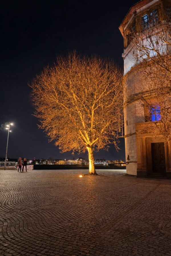 Historische Plätze und Promenaden: Wie auf den Bildern am Rheinufer in Düsseldorf zu sehen, verbinden wir mit Licht die Historie der Gebäude mit der Natur. Die beleuchteten Bäume säumen den Weg und schaffen eine exklusive Flaniermeile, die auch nach Sonnenuntergang belebt bleibt. Unternehmenssitze und repräsentative Außenanlagen: Ein imposanter, beleuchteter Baum vor einem Firmengebäude signalisiert Beständigkeit, Wertschätzung der Natur und einen Sinn für Ästhetik. Es ist eine Visitenkarte aus Licht. Öffentliche Plätze und Marktplätze: Hier werden Bäume zu zentralen Treffpunkten. Das Licht schafft einen Raum im Raum, eine Zone der Geborgenheit inmitten der Weite des Platzes.