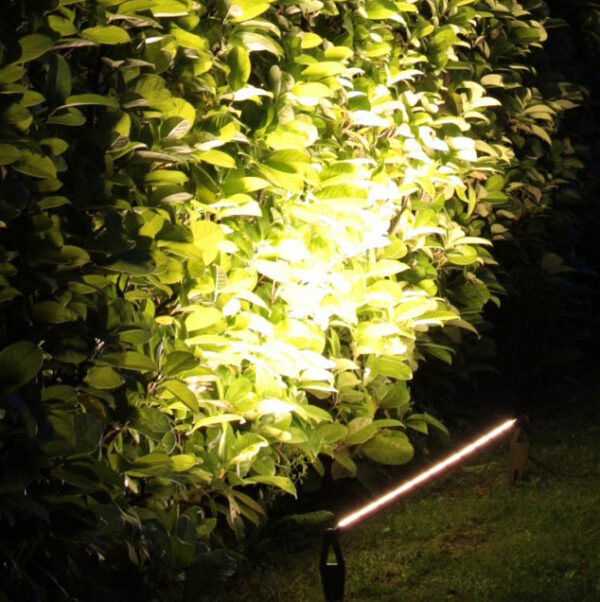 Größere Abschnitte in der Außenanlage, wie Bäume, Hecken, Gartenpavillons oder Fassaden,die auch in den Nachtstunden nicht unbemerkt bleiben sollen, lassen sich mit der Boden Lichtleiste für Gartenanstrahlungen effektvoll betonen. Die Boden Lichtleiste sorgt aufgrund ihrer Breite für eine flächige Umgebungsbeleuchtung in Warmweiß. Dabei handelt es sich bei diesem Beleuchtungsobjekt um eine Erdspießleuchte, die mit einem schwenkbaren LED-Balken ( 15 X 15 Millimeter) ausgestattet ist, der sich schwenken lässt. In diesem wurden hocheffiziente LEDs verbaut, die in eingeschaltetem Zustand eine faszinierende, diffuse Lichterinsel erzeugen, die Objekte oder Wege im Außenbereich wunderbar inszenieren.