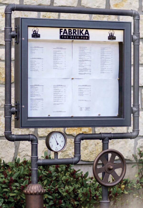 Viele Restaurants folgen, um dem Gast ein besonders Erlebnis zu bieten, einem abgestimmten Gestaltungsbild. Nur wenn hier alles stimmt und die Gäste sich wohlfühlen, werden Sie mit einem positiven Eindruck nach Hause gehen, selbst wiederkommen und es ihren Freunden erzählen. Nicht selten entscheidet der stilsicher gewählte Außenbereich, ob der Gast überhaupt eintritt.  Um unter den zahlreichen Außen-Gastronomien besonders hervorzustechen, eignen sich gut durchdachte Werbemittel. Denn diese haben eine oft unterschätzte, enorme Branding-Wirkung, wie zahlreiche Studien belegen. Wie in diesem Beispiel schmückt ein speziell nach Kundenwunsch angepasster exklusiver Schaukasten mit Licht für außen das Restaurant und informiert Kunden und Passanten über das aktuelle Angebot.  Der Schaukasten ist absolut wetterfest, äußerst robust und ideal für den Außenbereich. Ausgestattet ist er mit einer effizienten, stromsparenden LED-Beleuchtungstechnik, die sich hinter der Textblende befindet. Seitlich sind stabile eckige Rohre angebracht. Sie bestehen aus hochwertigen Stahl mit einer Lackierung in Holzoptik. Diese Ständer halten den Schaukasten sicher und sind so aufgestellt, dass auch ein heftiger Sturm oder Orkanböen dem Schaukasten nichts anhaben kann.  An den Ständern ist  jeweils eine urtümliche Wandleuchte mit hohem Spitzdach platziert. Traditionelle Handwerkskunst offenbart sich in allen Details dieser handgeschmiedeten Außenlampen, die sich auch für Fassaden und Eingänge ebenso eignet wie für den Balkon und die Terrasse und für eine einladende Beleuchtung sorgt.