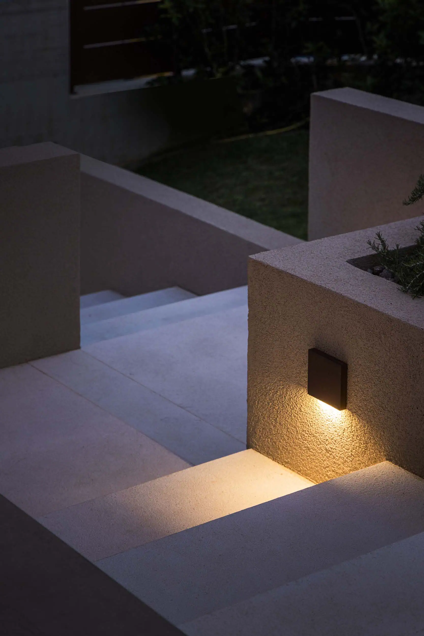 Durch die flache Bauform lässt sich die Leuchte bündig in die Wand integrieren. Sie schließt sauber mit der Oberfläche ab und erzeugt keine vorstehenden Kanten. Dadurch bleibt die architektonische Linie erhalten, was insbesondere bei modernen Fassaden und reduzierten Treppenanlagen von entscheidender Bedeutung ist.