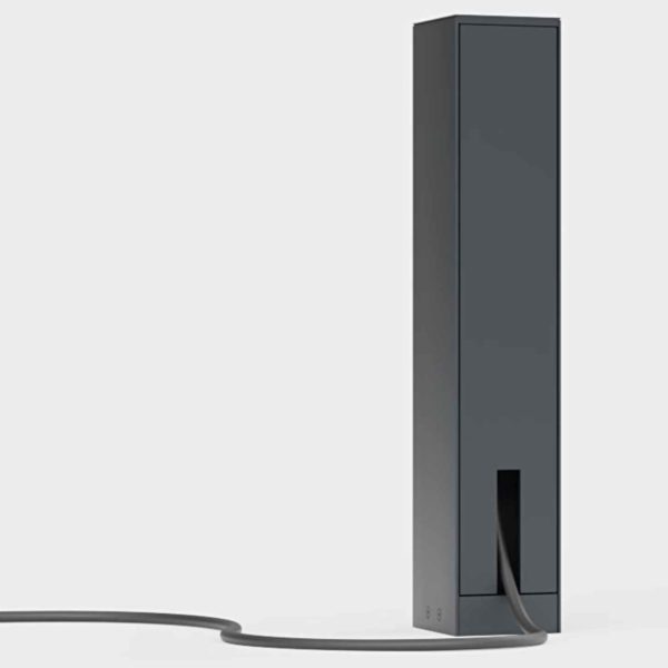 Ein besonderes Highlight ist die innovative Kabelführung: Die Kabel werden durch einen vertikalen Spalt an der Unterseite der Säule geführt. Dies sorgt dafür, dass selbst bei eingestecktem Stecker das minimalistische Design der Säule erhalten bleibt. Die Kabelführung ist nicht nur ästhetisch ansprechend, sondern auch praktisch, da sie das Risiko von Stolperfallen minimiert.