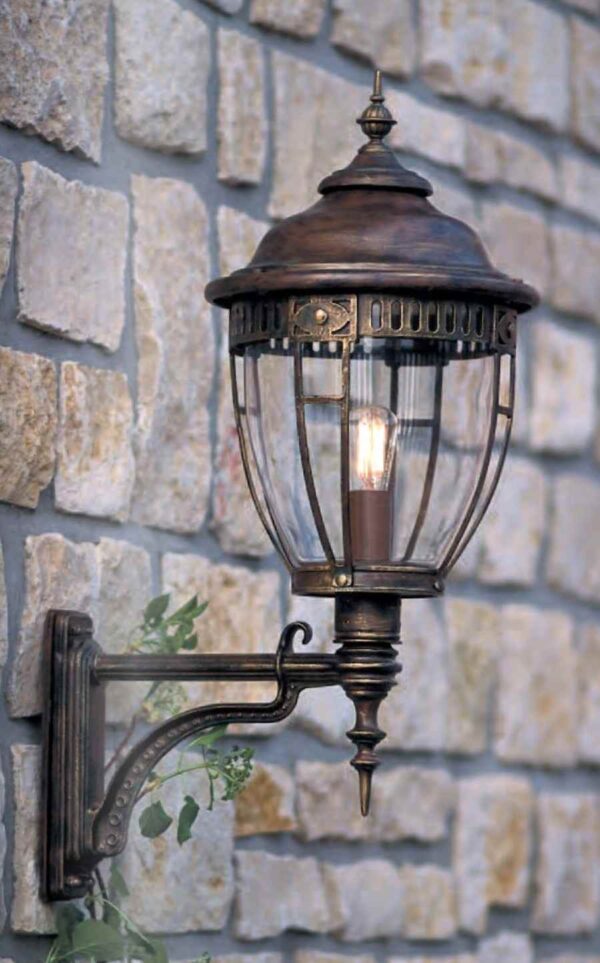 Die große Außen Wandleuchte mit Glaskuppel ist eine klassische Außenlampe, hat aber aufgrund der schlichten Wandstütze zugleich ein zeitloses Design. Zahlreiche feine Details der Laternenhaube, allesamt händisch gefertigt, bestimmen das Bild dieser klassischen Wandlaterne mit Rundmantelglas. Die ansprechende Bauform eignet sich für historische Anwesen, aber auch Außenbereiche im Landhaus-Stil. Der Leuchtenkorpus hat eine Breite von 390 mm und ist inklusive Spitze 960 mm hoch. Selbstverständlich werden für die große Außenwandleuchte nur hochwertige Materialien verwendet, die für Wertbeständigkeit und zeitlose Gestaltung stehen. Die Außenwandleuchte wird aus massivem Schmiedeeisen in Deutschland per Hand hergestellt. Für die Verglasung wurde mundgeblasenem Kristallglas ausgewählt. Die klare Verglasung sorgt für optimalen Lichtfluss. Aufgrund der verwendeten E27 Fassung können diverse Leuchtmittel zum Einsatz kommen. Besonders schön zart und angenehm hell leuchtet die Leuchte mit einem Rustika-Leuchtmittel, welches somit auch gekonnt den nostalgischen Charme der Wandleuchte unterstreicht. Dank der feuerverzinkten und lackierten Oberfläche des Schmiedeeisens hält die Wandlampe jeder gängigen Witterung bestens stand. Die Beschichtung ist sehr hochwertig und wird aufwendig von Hand aufgebracht, leichte Farbabweichungen sind daher möglich. Die Wandleuchte ist in 11 verschiedenen Lackierungen (Vintage, Eisen Natur, Patina, Eisen rostig, Terra, Alt-Kupfer, Messing antik, Alt-Bronze, Antik-Grün, Schwarz-Silber, Altschwarz matt) erhältlich, selbstverständlich können die Leuchten auch in jeder RAL-Farbe lackiert werden. So wird jede Leuchte zu einem unverwechselbaren Unikat. Dabei entsprechen sie den modernsten, lichttechnischen Gesichtspunkten. Die Wandleuchte ist auch in einer kleineren und einer großen Variante erhältlich sowie auch Decken-, Sockel- und Standleuchten.