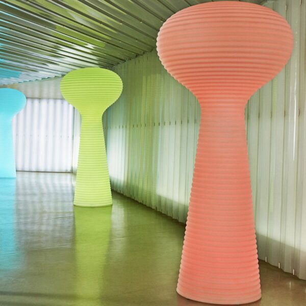 Die großen skulpturalen Lichtgestalten für den Außenreich sind nicht nur aufgrund ihres Designs etwas Außergewöhnliches. Die von der Natur inspirierten Lichtgestalten zeichnen sich durch abgerundete Elemente und flüssige, ausdrucksvolle Formen aus. Das weiße Polyethylen, aus dem der Korpus besteht, bewirkt einen blendfreien Lichtschein und eine Rundum-Lichtverteilung. Eine besondere Raffinesse erhalten die Leuchten durch die gerillte Oberfläche, durch den sie sich optisch abheben. Auch die Ausstattung mit Schutzart IP65 ist ein ganz besonderes Merkmal. Dadurch wird nämlich die Verwendung im Außenbereich möglich. Die großen skulpturalen Lichtgestalten sind vielseitig platzierbare Leuchte. Durch den Durchmesser von 880 Millimeter und die Höhe von 1900 Millimeter wirken sie besonders im großzügig angelegten Außenbereichen und auf großen Terrassen. Auch im Außenbereich von Hotels oder Restaurants können sie zur dekorativen Illumination eingesetzt werden und auch in Innenräumen setzen die Leuchten einen strahlenden Akzent, beispielsweise in einer Hotellobby oder dem Spa-Bereich.