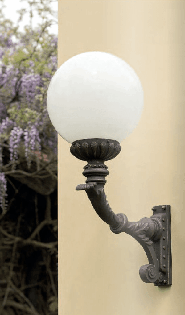 Die große stilvolle Kugel Wandleuchte ist eine klassische Wandlaterne mit opalem Kugelglas und dekarotivem Arm. Die bezaubernde Außenwandleuchte verbreitet mit ihrem Design ein typisch nostalgisch, exklusives Flair. Über und über zieren kunstvolle Schnörkel den kompletten Leuchtenarm, der aus einem hochwertigen Schmiedeeisen besteht, und auf dem das kugelrunde Opalglas platziert wurde. Als Lichtquelle kann ein Leuchtmittel mit E27 Fassung eingesetzt werden.