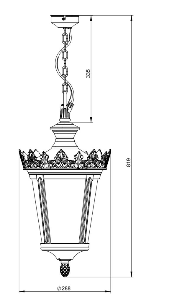 Die Hängelaterne mit goldfarbener Verzierung ist eine erlesene Außenleuchte von höchster Qualität und begeistert mit ihrem edlem Design und der markanten Form. Das klassische Design der Hängelaterne macht sie im Tageslicht zum Blickfang im Eingangsbereich oder für viele Überdachungen im Außenbereich, insbesondere natürlich für Balkone und Terrassen. Mit den Verzierungen am Lampenkopf im Empire Stil und den leicht verspielten Leuchtensockel lässt sich gut erkennen, wie filigran und hochwertig die Fertigung der Leuchte erfolgte. Als Inspiration dienten den Designern stilvolle Leuchten an französischen Chalets oder Schlössern. Die Luxusvariante für Kunden, die sich für sehr exklusive und individuelle Beleuchtung begeistern, beinhaltet die Verwendung des goldfarbenen Kronenbandes am oberen Abschluss dieser geschmackvollen Hängeleuchte. Als typische Verzierung finden Sie am unteren Ende der Leuchte den Pinienzapfen.