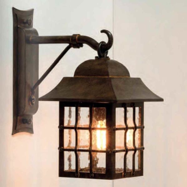 Die hängende Wandleuchte für außen im Landhausstil sorgt für ein gemütliches Ambiente und lädt zum Verweilen ein. Sie eignet sich als Terrassenlampe ebenso wie für den Eingangsbereich. Sowohl die Anmutung als auch die Herstellung dieser eisernen Wandleuchte führen uns zurück in vorindustrielle Zeiten. Die Bauform entspricht rustikalen wetterfesten Kerzenleuchten. Für die Außenwandleuchte werden nur hochwertige Materialien verwendet, die für Wertbeständigkeit und zeitlose Gestaltung stehen. Die Außenwandleuchte wird aus massivem Schmiedeeisen in Deutschland per Hand hergestellt. Die vergitterten Glasscheiben haben kleine Lufteinschlüsse (sog. Antikglas), welche zum Abblenden des Lichtes beitragen. Besonders schön zart und angenehm hell leuchtet die Leuchte mit einem Rustika-Leuchtmittel, welches somit auch gekonnt den nostalgischen Charme der Wandleuchte unterstreicht. Der Leuchtenkorpus hat eine Breite von 300 mm und ist 560 mm hoch. Dank der feuerverzinkten und lackierten Oberfläche des Schmiedeeisens hält die Wandlampe jeder gängigen Witterung bestens stand. Die Beschichtung ist sehr hochwertig und wird aufwendig von Hand aufgebracht, leichte Farbabweichungen sind daher möglich. Die Wandleuchte ist in 11 verschiedenen Lackierungen (Vintage, Eisen Natur, Patina, Eisen rostig, Terra, Alt-Kupfer, Messing antik, Alt-Bronze, Antik-Grün, Schwarz-Silber, Altschwarz matt) erhältlich, selbstverständlich können die Leuchten auch in jeder RAL-Farbe lackiert werden. So wird jede Leuchte zu einem unverwechselbaren Unikat. Der Hersteller dieser Außenleuchte kann eine lange Tradition vorweisen. Dabei zeichnet ihn eine gleichbleibend hohe Qualität aus – das gilt heute noch genauso wie in den Anfängen – und um diese zu gewährleisten, werden die Leuchten ausschließlich in Deutschland gefertigt. Zudem werden nur ausgesuchte Materialien verwendet, die auch härteren Umwelteinflüssen standhalten und so lang anhaltende Freude versprechen. Zudem versteht der Hersteller die Nachhaltigkeit auch als Ansporn, die Weiterführung der Handwerkstradition sicherzustellen. Mit der Ausbildung junger Menschen zum Schmied trägt die Firma dazu bei, eine seit dem Altertum bestehende Tradition aufrechtzuerhalten und sie mit Kreativität und modernen Impulsen zu Produkten von zeitlosem Design zu verschmelzen, wie bei der gezeigten Wandleuchte außen. Dabei entsprechen sie den modernsten, lichttechnischen Gesichtspunkten. Das Leuchtenmodell gibt es auch als Pendelleuchte, Sockel- oder Standleuchte sowie als Wandleuchte ohne Arm .
