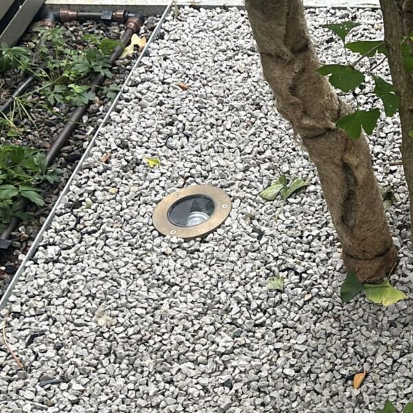 Hochwertige Baum Bodeneinbauscheinwerfer im Kiesbett und professionelles Zubehör