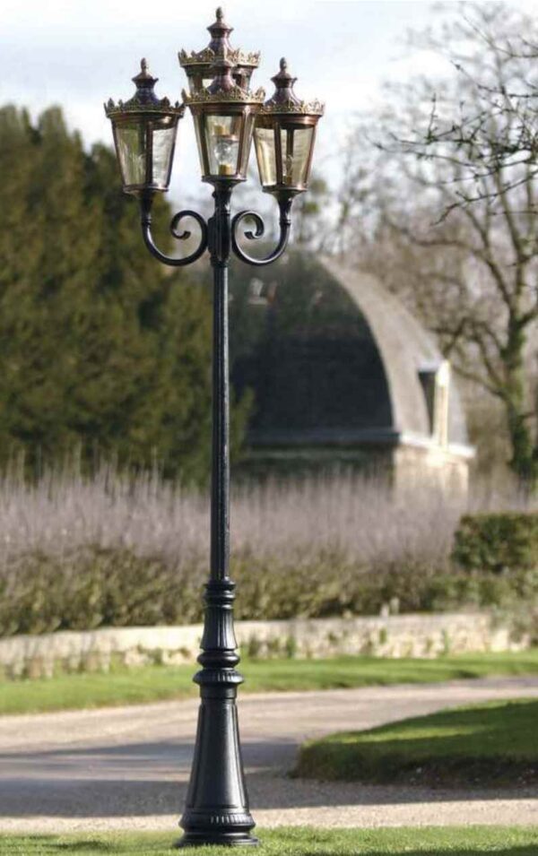 Die Kupfer Laterne außen besteht nur aus runden Formen und wirkt dadurch besonders weich und interessant. Sie st eine erlesene Außenleuchte von höchster Qualität. Die vierflammige Laterne im Empirestil ist aus edlem Kupfer hergestellt. Der Mast und die Leuchtenarme werden aus hochwertigem Aluminium gegossen und in schwarz lackiert. Die Leuchten selbst bestehen aus Kupfer, welches aufwendig in Handarbeit patiniert wurde. Der klare Glasdiffusor streut ein helles Licht. Diese hochwertige Kupfer Laterne außen wird mit einer 25 jährigen Garantie gegen Korrosion ausgeliefert. Mit den Maßen von 2824 x 784 x 300 ist die Kupfer Laterne außen einfach perfekt für exklusive Platzbedürfnisse, auch in Ihrem Garten. Dieses Modell ist hervorragend dazu geeignet, große Flächen und weite Wege stilvoll in Szene zu setzen.