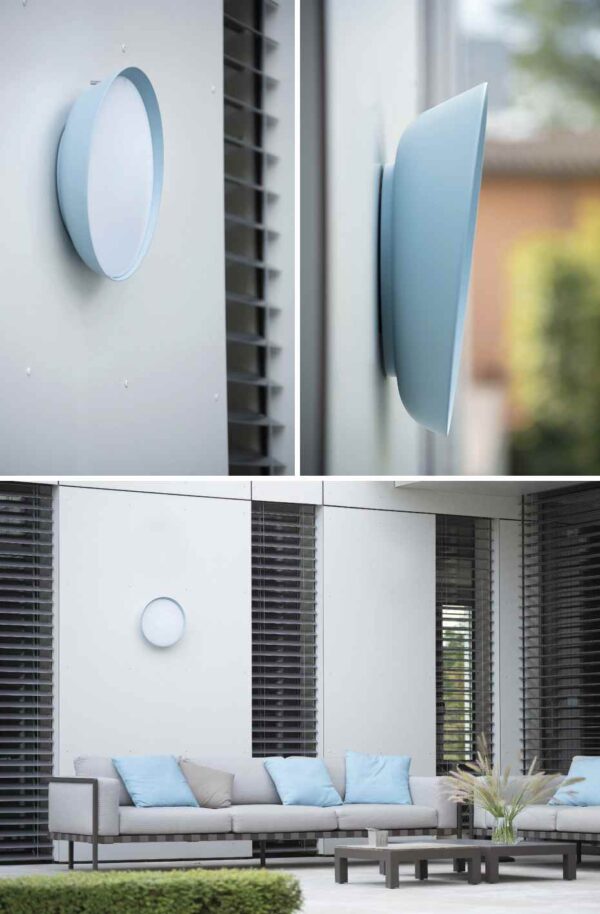 Die LED Decken und Wandleuchte außen in trendigen Farben ist immer eine gute Wahl, egal ob trendig modern oder traditionell und romantisch. Die LED Außenwand/ Deckenleuchte besticht durch die asymmetrische Form welche durch die trendigen Farben noch besser zur Geltung kommt. Der Diffuser aus opalen Polycarbonat sowie der Schirm aus Aluminium sind robust und Wasserbeständig, was die LED- Leuchte zu einer idealen Außenleuchte macht. Die Außenwandleuchte ist dank der innovativen LED Technologie nicht nur extrem Energieeffizient sondern auch äußerst langlebig. Die LED-Wandleuchte oder LED-Deckenleuchte für außen ist in 26 verschiedenen Standartfarben lieferbar. Zudem ist die moderne formschöne Lampe in drei Lichtausführungen wählbar. Es steht die normale Ausführung mit Verwendung einer Leuchtstoffröhre in Ringform mit max. 22 Watt, eine LED-Ausführung mit 23 Watt in warmweiß und eine LED-Ausführung mit 23 Watt in normalweißer Lichtfarbe zur Auswahl. Die Leuchte wird mittels Bumerangsystem an der Oberfläche montiert. Als Besonderheit kann diese Leuchte nach der Montage noch in der Neigung leicht geschwenkt werden.