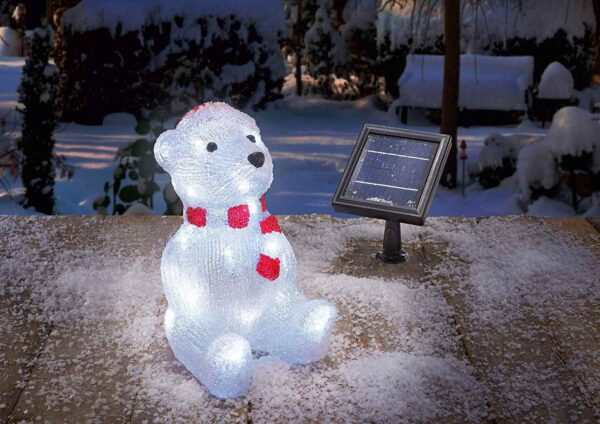 Der Leuchtbär außen mit Solar von Esotec macht im Garten platziert bei Tag und Nacht eine putzige Figur. Während des Tages wird das auftreffende Tages- und Sonnenlicht in elektrische Energie umgewandelt und der eingebaute Akku geladen. Bei Nacht schaltet sich die LED automatisch ein und sorgt für optimale Ausleuchtung der Figur. Ein großzügig dimensioniertes Solarmodul ermöglicht gute Ladung auch an sonnenarmen Tagen.