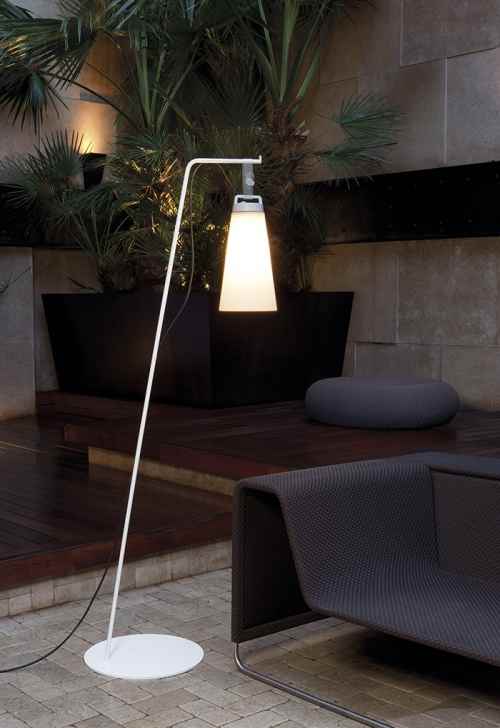 Die mobile flexible Stehlampe für außen besteht aus einem schlichten Leuchtenfuß aus weiß lackiertem Metall. An diesem wird der Leuchtenkörper aus weiß lackiertem Aluminium und weißem Polyethylen mit einer Schlaufe aus transparentem Silikon befestigt.