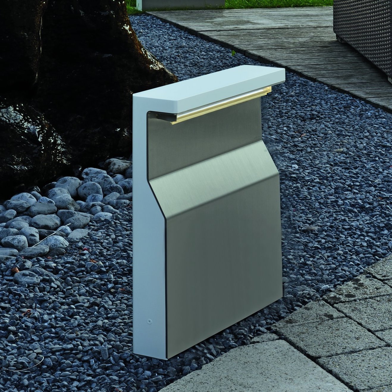 Betrachtet man das äußere Erscheinungsbild dieser Lichtlösung, so fällt sofort die schlanke Silhouette ins Auge, die eine Breite von exakt dreihundertfünfzig Millimetern aufweist. Diese Dimension ermöglicht es der Leuchte, Präsenz zu zeigen, ohne dabei massiv oder störend zu wirken. Das Gehäuse besteht aus einem präzise gefertigten Aluminiumkorpus, der durch eine spezielle Feinstruktur-Lackierung eine besonders edle und matte Haptik erhält. Diese Lackierung ist nicht nur ein optisches Highlight, sondern bietet auch einen hervorragenden Schutz gegen Witterungseinflüsse und mechanische Beanspruchung. Ein besonderes Merkmal im Design ist der Kontrast zwischen dem lackierten Aluminiumrahmen und dem inneren Reflektorelement. Dieses besteht aus hochwertigem, geschliffenem Edelstahl, welcher das von oben herabfallende Licht sanft aufnimmt und in den Außenraum lenkt. Die Kombination dieser beiden Werkstoffe sorgt für ein Spiel aus Licht und Schatten, das der Leuchte auch im ausgeschalteten Zustand eine gewisse Dynamik verleiht. Die Tiefe der Leuchte verjüngt sich von neunzig Millimetern im oberen Bereich auf siebzig Millimeter an der Basis, was ihr ein graziles und zugleich stabiles Profil verleiht. Diese architektonische Formensprache sorgt dafür, dass sich die Leuchte nahtlos in moderne Gartenkonzepte integriert, bei denen klare Kanten und hochwertige Oberflächen im Vordergrund stehen.
