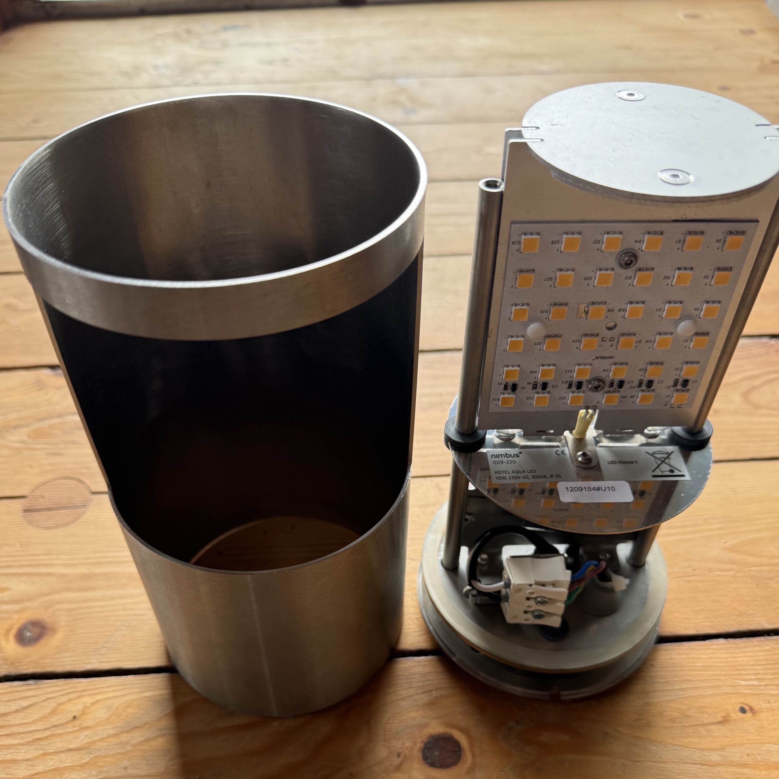 Das äußere Gehäuse besteht aus einem gebürsteten Edelstahlzylinder, der die technische Einheit vollständig umschließt. In Kombination mit dem satinierten Glas entsteht eine elegante Lichtstreuung ohne Blendwirkung. Genau diese Verbindung aus Technik und Design macht die Nimbus Hotel Aqua LED 009-230 Ersatzteile besonders interessant, denn durch den Austausch einzelner Komponenten kann die originale Optik vollständig erhalten bleiben.