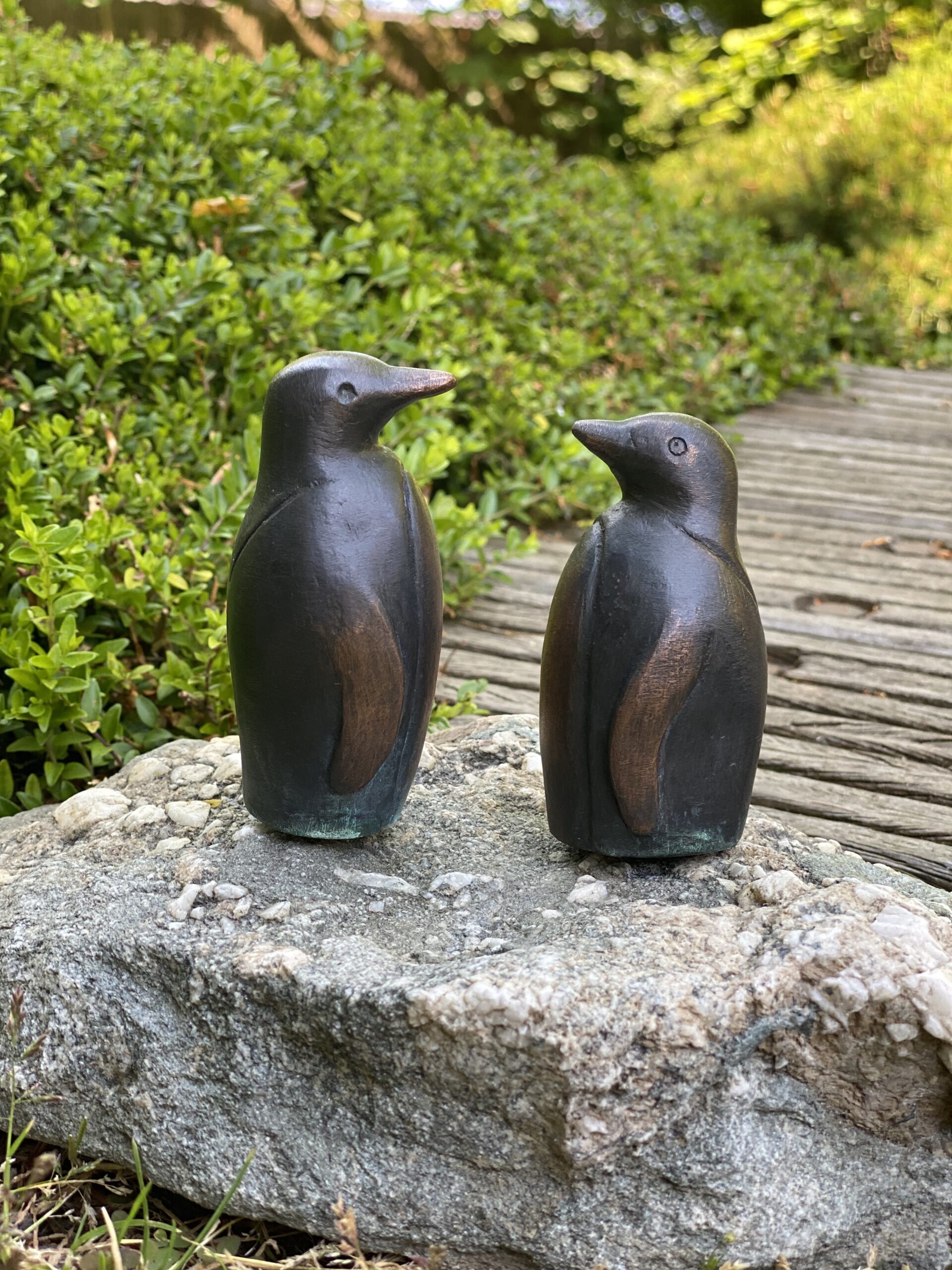 Diese Pinguin Figuren für den Garten zeichnen sich durch die schöne Patina und durch sehr detailliert ausgeformte Details aus. Die Figuren sind eine besondere Dekoration für den Garten, die Terrasse oder Ihren Gartenteich. Setzten Sie die Figuren auf einen Stein, einen Absatz, zwischen Mauersteine, an ihren Gartenteich oder auf ein Regal und schon zaubern Sie etwas Leben zwischen das Gemäuer. Natürlich sehen die Pinguin Figuren auch ganz toll in einem Bücherregal oder auf einer Fensterbank aus, Holen Sie sich diese Kupferfiguren in Ihren Garten und erfreuen sich sich lange am Anblick dieser Gartenfiguren, die absolut winter- und wetterfest ist. Diese Kupferfiguren sind ein von einem Bildhauer und Künstler entworfenes und erschaffenes Kunstwerk von bleibendem Wert.
