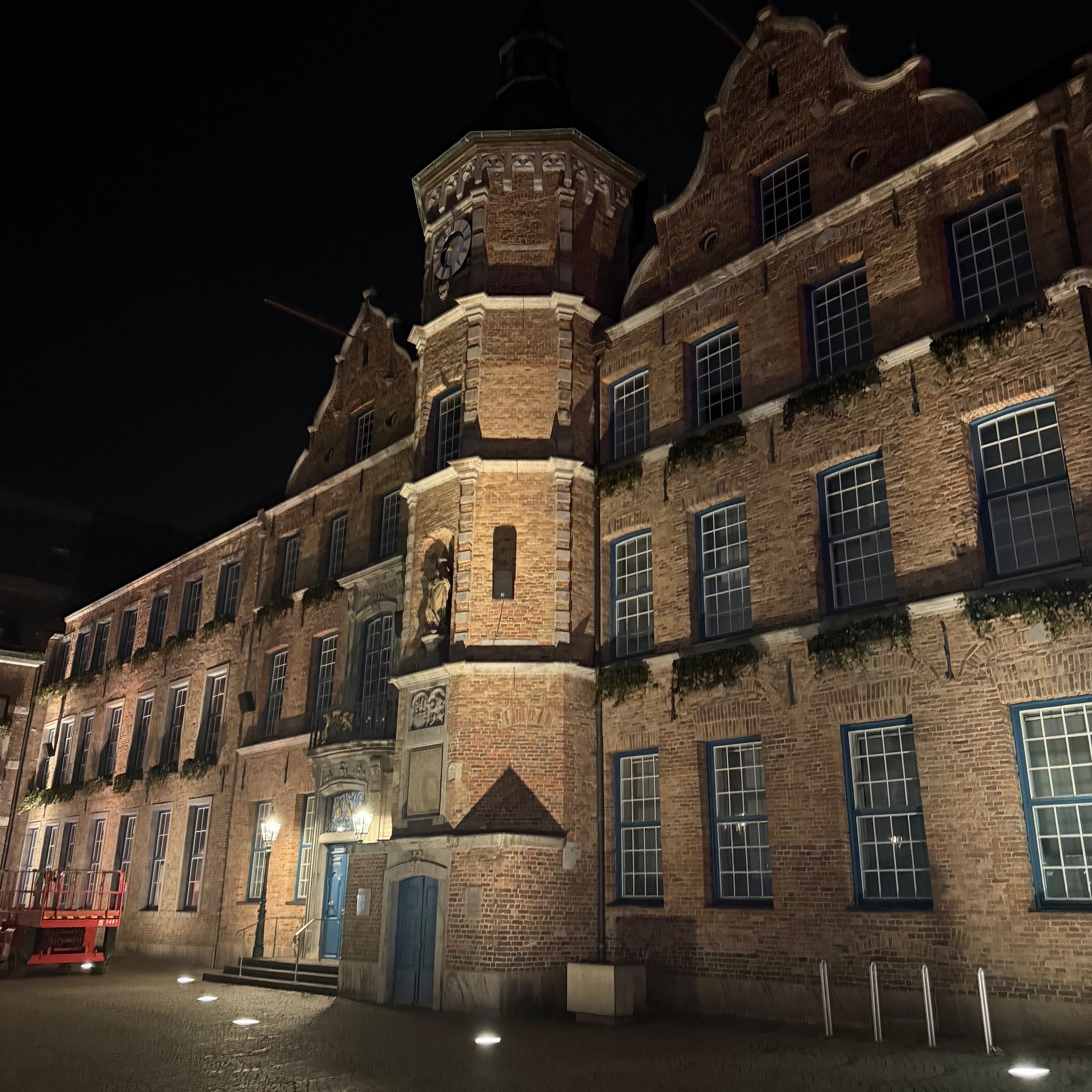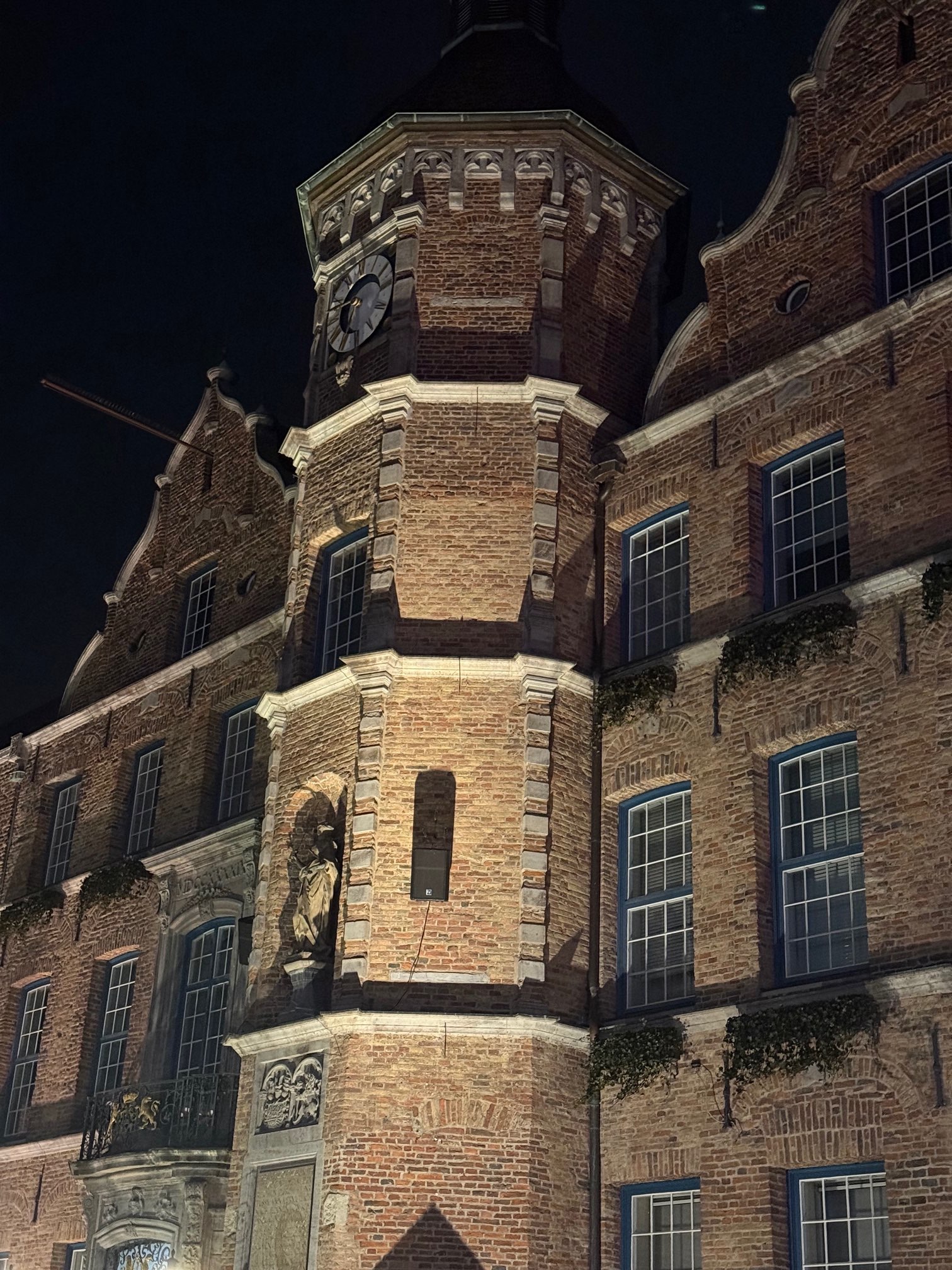 Die wahre Meisterschaft bei einer schönen Beleuchtung für historische öffentliche Gebäude zeigt sich in der Kombination unterschiedlicher Stilmittel. Im vorliegenden Beispiel sehen wir die perfekte Symbiose aus modernem Up-Lighting durch Bodenscheinwerfer und der klassischen Wandbeleuchtung. Während die Bodenstrahler für die monumentale Fernwirkung und die Betonung der vertikalen Linien zuständig sind, übernehmen die Laternen die Aufgabe der Nahbereichsausleuchtung. Sie markieren die Eingänge und Portale, schaffen ein menschliches Maß und vermitteln eine nostalgische Wärme, die perfekt zum historischen Backstein passt. Diese Kombination aus Boden- und Wandleuchten erlaubt es, verschiedene Ebenen der Architektur gleichzeitig zu bespielen. Die Schattenwürfe unter den Gesimsen und die Lichtreflexionen in den Fensterscheiben erzeugen eine Tiefe, die das Gebäude nachts fast plastischer wirken lässt als am Tag. Eine schöne Beleuchtung für historische öffentliche Gebäude nutzt diese Kontraste gezielt aus, um die Einzigartigkeit der Bauweise, wie etwa die kunstvollen Dachgiebel und die rhythmische Anordnung der Fenster, hervorzuheben.