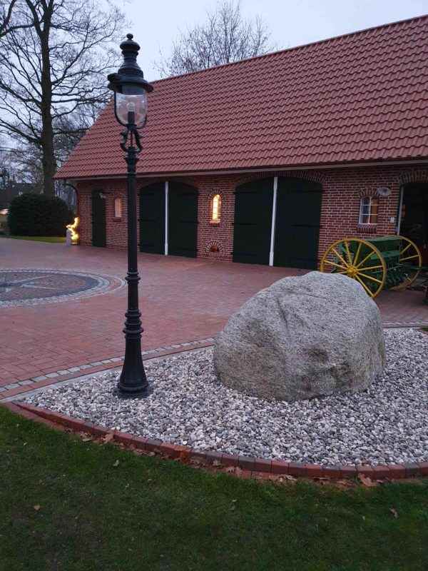 Die schöne neue Laterne typisch Hamburg präsentiert sich als dekoratives Element für den Garten und sorgt für optimale Helligkeit bei Nacht. Dieses zeitlos schöne Modell im traditionellen Stil ist eine elektrifizierte Nachbildung historischer Gasleuchten und mit Liebe zum Detail gefertigt. Die Laterne wirkt durch ihre Materialkombination aus Schmiedeeisen und Glas sehr klassisch und zugleich elegant. Die Leiterstütze sowie Verzierungen und der aufwendig entworfene untere Mastbereich unterstreichen den edlen Stil dieser Laterne. Überall dort, wo im Außenbereich eine gute Orientierung gebraucht wird, bietet sich die Laterne an. Ob Parkplätze, Zufahrtswege, Eingangsbereiche, Vorgarten, Garten oder Gartenpfade, alle werden zuverlässig und sicher erhellt. Dabei strahlt das Licht der hochwertigen Laterne durch das Zylinderglas gleichmäßig in die Umgebung.