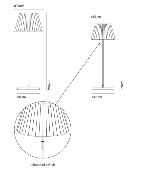Abmessungen Höhe 170 mm; Schirm Ø: 580 mm; Basis Ø: 413 mm/ Höhe 2040 mm; Schirm Ø: 700 mm; Basis Ø: 498 mm