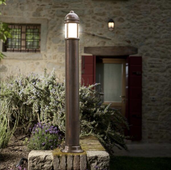 Die stilvollen Messing Garten Pollerleuchten in verschiedenen Höhen erinnern von ihrer Formgebung im ersten Moment an Hafen- und Schiffsleuchten. Dabei erweisen sich sowohl die Bauform als auch die Fertigungsqualität dieser italienischen Gartenleuchten ihren historischen Vorbilder als würdig. Mit dem mundgeblasenes Opalglas sorgen die Pollerleuchten für die blendfreie Illumination von Wegen, Eingangsbereichen, Terrassen und Vorplätzen.