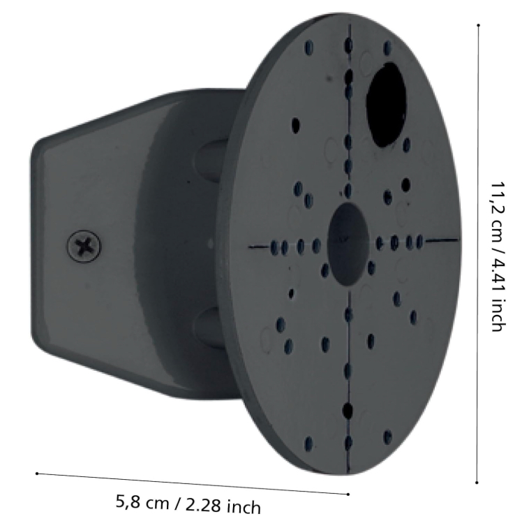 Dadurch, dass die Frontplatte einen Durchmesser von 11,2 cm hat, bietet sie genügend Raum, um auch eventuell benötigte Lüsterklemmen oder wasserdichte Kabelverbinder sicher unter dem Baldachin der eigentlichen Leuchte zu verstauen. Man muss also keine tiefen Löcher in die Fassade stemmen, um die Technik unterzubringen, da die Halterung selbst einen gewissen Hohlraum schafft. Die Vielzahl an vorgefertigten Löchern in der Platte erspart zudem mühsames Nachbohren im harten Metall. Man kann die Leuchte einfach anhalten, die passenden Löcher auswählen und die Schrauben eindrehen. Dies spart Zeit und schont die Nerven bei der Montage in luftiger Höhe auf einer Leiter. Die seitlich angebrachten Kreuzschlitzschrauben dienen dazu, die Frontplatte fest mit dem Wandwinkel zu verbinden, was eine rüttelfreie Montage garantiert.