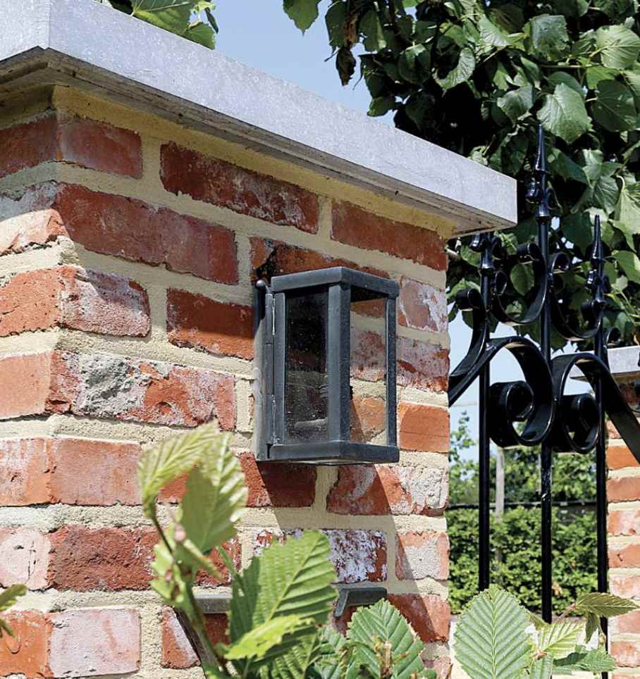 Die Wandlampe außen am Torpfeiler sieht aus wie die moderne Interpretation einer klassischen Laterne und veredelt jeden Torpfeiler.