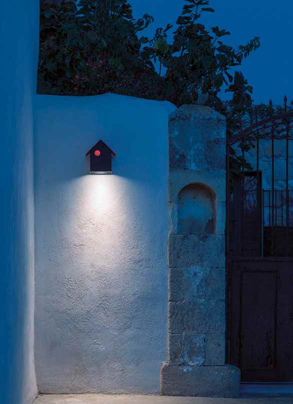 Die Wandlampe Vogelhaus aus lackierten Metall mit LED Leuchtmittel, IP65 , ist ein sympathischen Hingucker an der Hauswand oder am Baum.